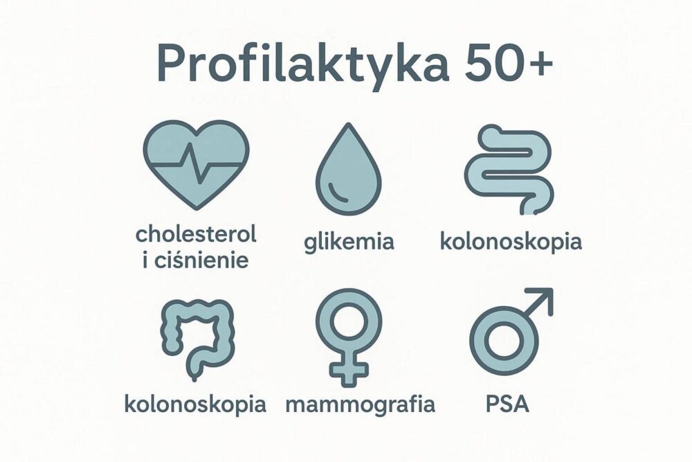 Profilaktyka to jedna z najprostszych dróg do długiego życia, bo wiele chorób rozwija się bez wyraźnych objawów. Po pięćdziesiątce ważne jest regularne sprawdzanie poziomu cukru (glikemii) i cholesterolu, aby ocenić ryzyko chorób serca i cukrzycy typu 2. Bardzo ważna jest kolonoskopia, która pozwala wcześnie wykryć zmiany w jelicie grubym.